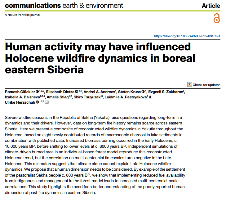 Boreal forests of eastern Siberia are often believed to be historically unmanaged. But are they really? Our new study in Communications Earth & Environment (see screenshot below) uses both paleoecological fire reconstructions and simulations with a fire-vegetation model to demonstrate that humans likely affected fire regimes earlier than previously expected. Our findings have relevance for modern fire management policies: They suggest that Indigenous practices may have successfully reduced fueld loads and kept severe wildfires at distance from settlements already hundreds of years ago. These practices involved cultural burning, which is today prohibited. Find the full study here:
